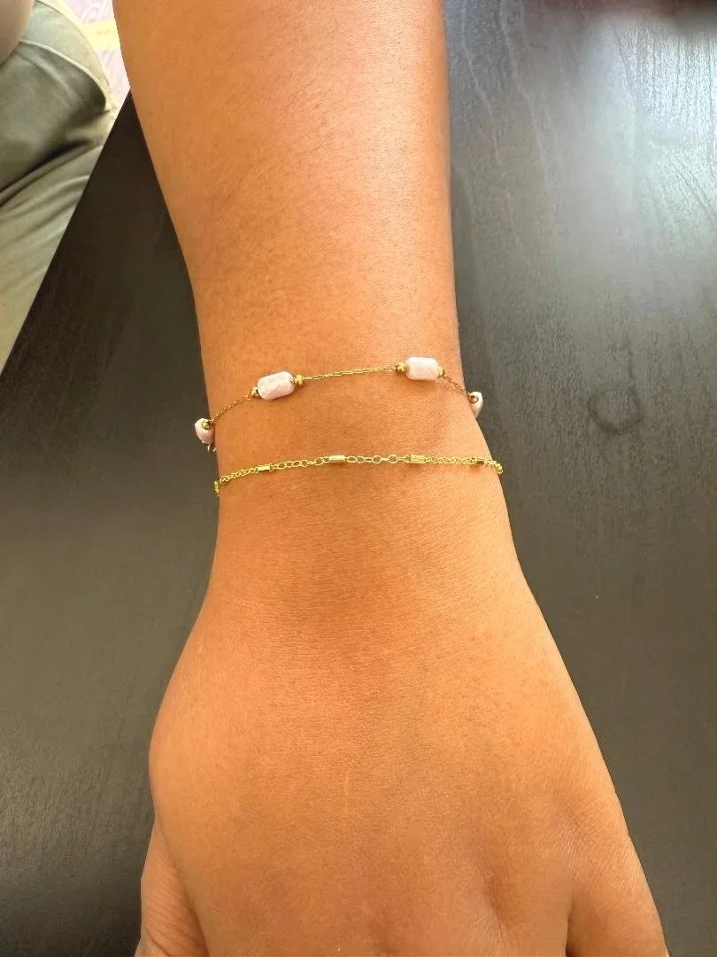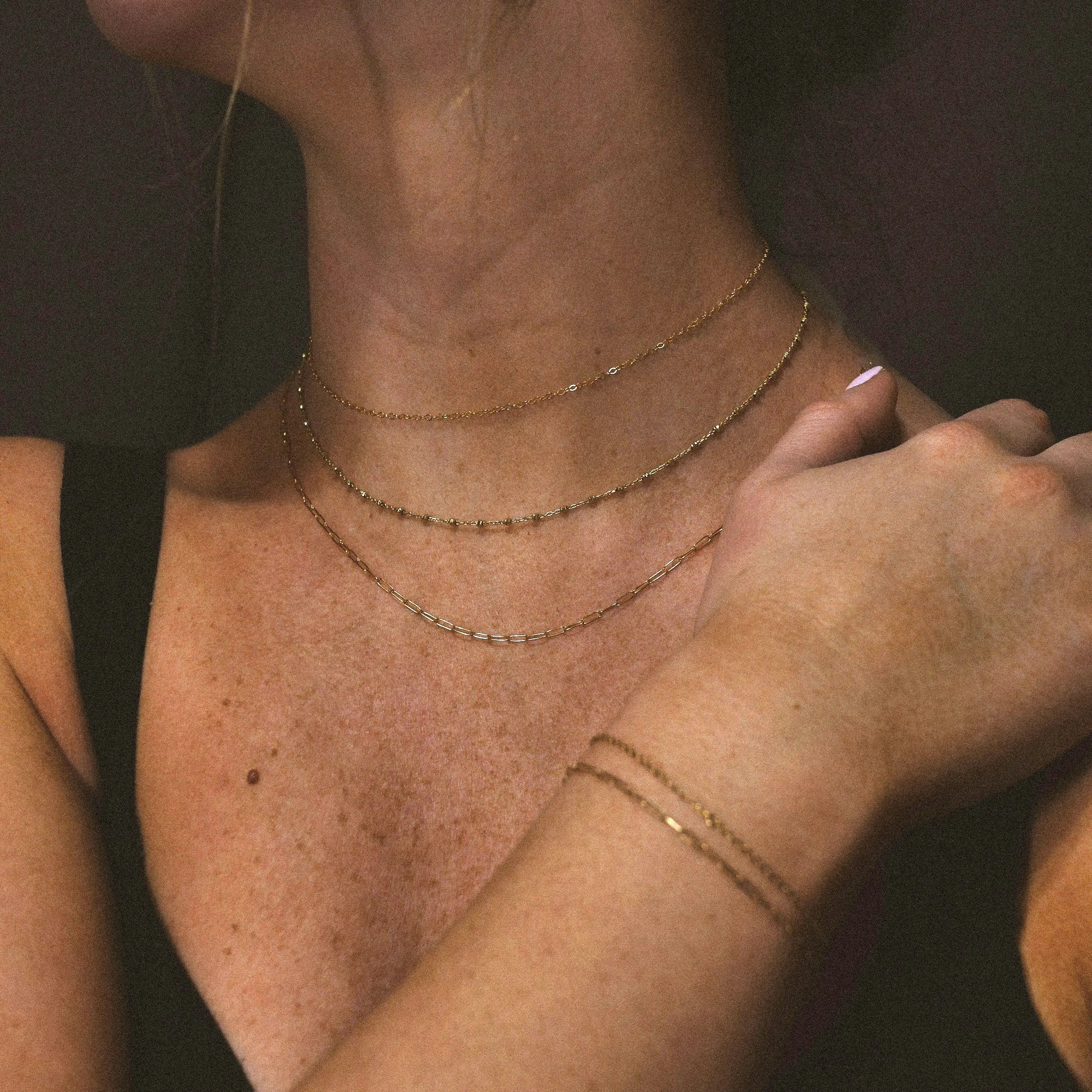 For those seeking the appeal of gold without the hefty price tag, Gold-filled chains are an excellent option for permanent jewelry. Not to be confused with gold-plated, which is prone to tarnishing and losing its shine. Gold-filled jewelry consists of a layer of gold bonded to a base metal core, offering the look and feel of solid gold at a fraction of the cost. The thickness of the gold layer distinguishes various Gold-Filled chain options. Gold-filled chains are known for their durability and resistance to tarnishing. The thicker the layer of gold, the more long-lasting the piece. Gold-Filled is hypoallergenic and the best option for those with skin sensitivities.